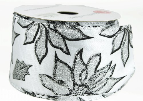 Wired Edge Poinsettia Ribbon Silver 2.5" x 10 Yards – Elegant Holiday Crafting and Decorating Ribbon