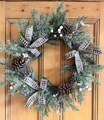 Frosted Pine Christmas Door Wreath with Pine Cones, Black & White Gingham Bows & White Berries – 24