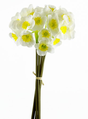 This faux daffodil bunch is the perfect way to add a touch of springtime beauty to your decor. This bunch features six individual stems, each with four daffodil flowers, with a diameter of approximately 2.5 inches each flower.