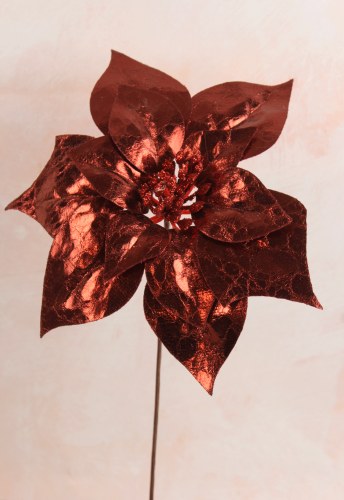 Add a touch of festive elegance to your holiday decor with this metallic artificial poinsettia pick in a stunning deep burgundy red. Measuring 19 cm in both stem length and flower diameter, this poinsettia features a glittery center that sparkles under the light, making it perfect for wreaths, centerpieces, or holiday arrangements. The metallic finish adds a rich, luxurious look to any setting, bringing warmth and sophistication to your seasonal decor.