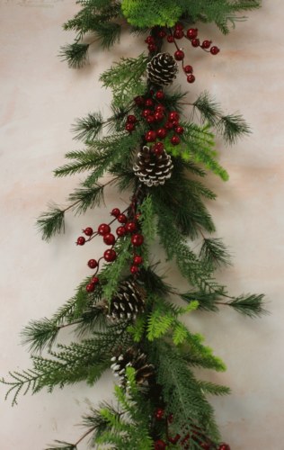 Features: Faux spruce, natural-look pine cones, red berries